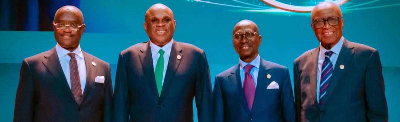 L-R: Incoming President and Chairman of the Board of Directors, Afreximbank, Dr. George Elombi; Outgoing President, Prof. Benedict Oramah; former Presidents, Mr. Jean Louis Ekra, and Mr. Christopher Edordu, at a farewell ceremony organised for Oramah in Cairo, Egypt…yesterday