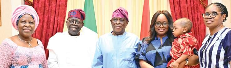 L-R: Beere Aderinsola Osoba; President Bola Tinubu; former Governor of Ogun State, Chief Segun Osoba, Mrs. Yinka Osoba-Apata; her baby, Kitan and Mrs. Kemi Osoba-Hassan, when the Osoba family paid a Sallah courtesy visit to the President in Lagos…yesterday