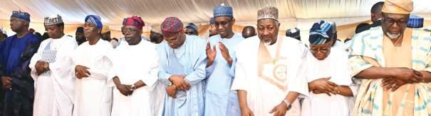 L-R: Former Minister of Works, Raji Fashola; Minister of State for Defence, Bello Muhammed Matawalle; Lagos State Deputy Governor, Kadri Hamzat; President Bola Tinubu; Chief of Staff to the President, Femi Gbajabiamila; National Security Adviser, Nuhu Ribadu; Minister of Defence, Muhammed Badaru Abubakar; Minister of Blue Economy, Adegboyega Oyetola and Prof. Shaffideen Adeniyi Amuwo, during the Eid-el-Kabir prayer at the Dodan Barracks prayer ground Lagos…yesterday