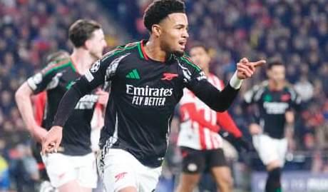 Nwaneri celebrates his goal against pSV in the Champions League