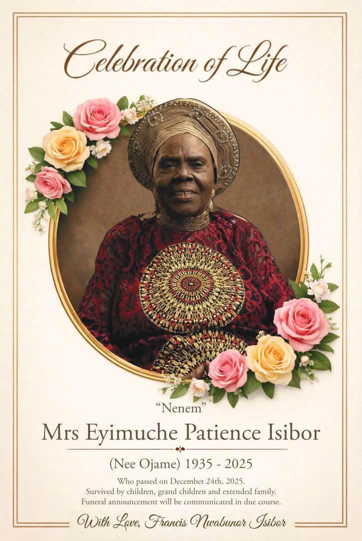 A Memorial Service will be held on Monday, January 26th, 2026 at Ikoyi Baptist Church, 5-7, Lateef Jakande Avenue, Ikoyi, Lagos at 11:00 am.