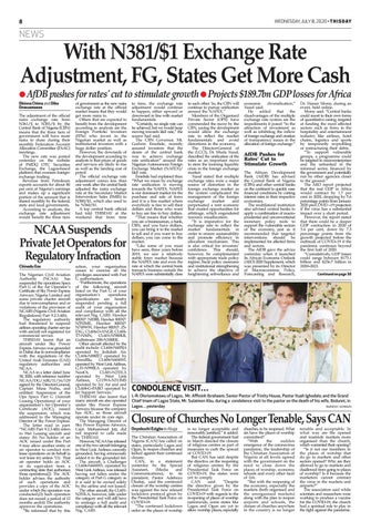 With N381/$1 Exchange Rate Adjustment, FG, States Get More Cash AfDB pushes for rates' cut to stimulate growth Projects $189.7bn GDP losses for Africa Obinna Chima and Dike Onwuamaeze The adjustment of the official naira exchange rate from N361/$ to N381/$ by the Central Bank of Nigeria (CBN) means that the three tiers of government will have more naira to share during their monthly Federation Account Allocation Committee (FAAC) meetings. The new rate was posted yesterday on the website of FMDQ OTC Securities Exchange, the Lagos-based platform that oversees foreignexchange trading. Revenue from Petroleum exports accounts for about 80 per cent of Nigeria’s earnings and makes up a significant portion of the amount that is shared monthly by the federal, state and local governments. According to analysts, the exchange rate adjustment would benefit the three tiers