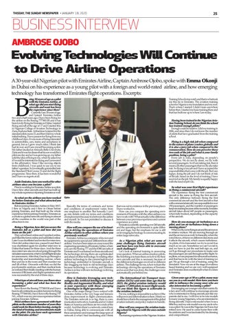 Being a Nigerian, how did you secure the Emirates Job as a pilot and how did you learn on the job? They advertised online and I applied online, and filled the forms online and submitted online. Later I was shortlisted and invited for interview. I first did online interview, passed it and then I was shortlisted again for another interview in Dubai that lasted for three days. And the three days interview also involved going through the simulatorassessment,whichwasfullflightsimulator assessment. After that, I had to go through a leadership and team-building exercise, where they put me in the room and then monitor me and all of that. Onwards with that, we did the psychometric analyses, and then medical tests as well and then finally meeting with the human resource (HR) team and flight operations and I was successful by the end of three days.