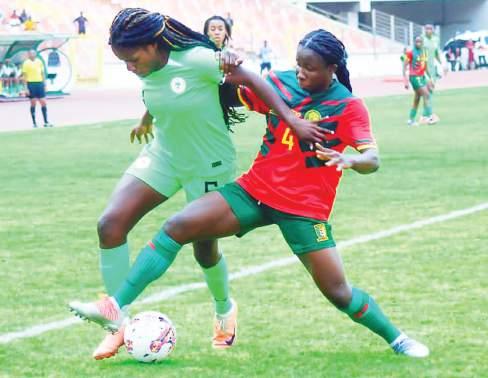 Goalscorer Esther Okoronkwo (left) in a duel with Cameroon’s Mariane Maague in Abuja ....on Monday