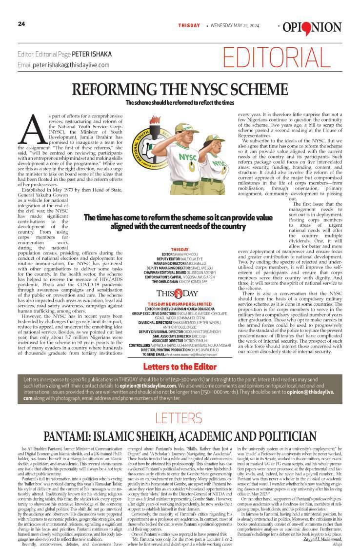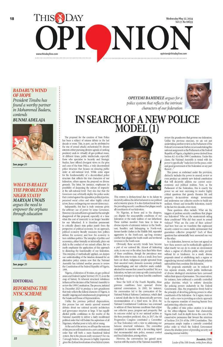 TRUTH & REASON Wednesday, May 22, 2024 Price: N400 Printed and Published in Lagos by THISDAY Newspapers Limited. Lagos: 35 Creek Road, Apapa, Lagos. Abuja: Plot 1, Sector Centre B, Jabi Business District, Solomon Lar Way, Jabi North East, Abuja . All Correspondence to POBox 54749, Ikoyi, Lagos. EMAiL: editor@thisdaylive.com, info@thisdaylive.com. TELEPhoNE Lagos: 0802 2924721-2, 08022924485. Abuja: Tel: 08155555292, 08155555929 24/7 ADVERTiSiNG hoT LiNES: 0811 181 3085 0811 181 3086, 0811 181 3087, 0811 181 3088, 0811 181 3089, 0811 181 3090. ENQUiRiES & BooKiNG: adsbooking@thisdaylive.com