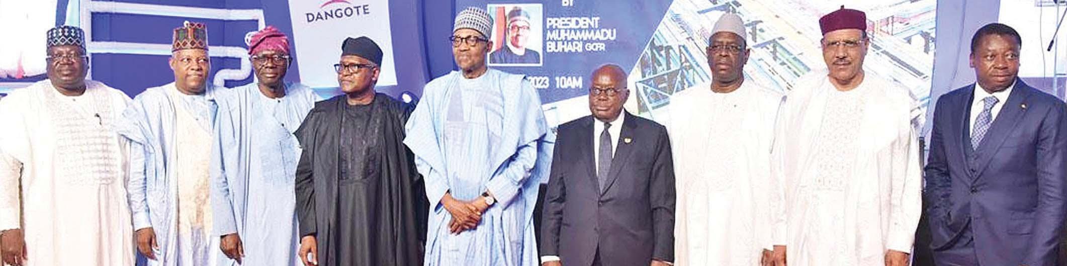 Governor, Babajide Sanwo-Olu; President/Chief Executive, Dangote Industries Limited, Aliko Dangote; President Muhammadu Buhari; President of Ghana, Nana Addo Akufo-Addo; President of Senegal, Mackey Sall; President of Niger, Mohamed Bazoum; and President of Togo, Faure Gnassingbe, during the formal inauguration of the multi billion dollar Dangote Petroleum Refinery and Petrochemicals FZE, in Ibeju-Lekki, Lagos ...