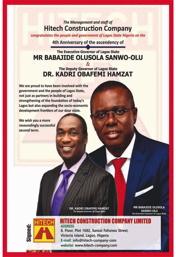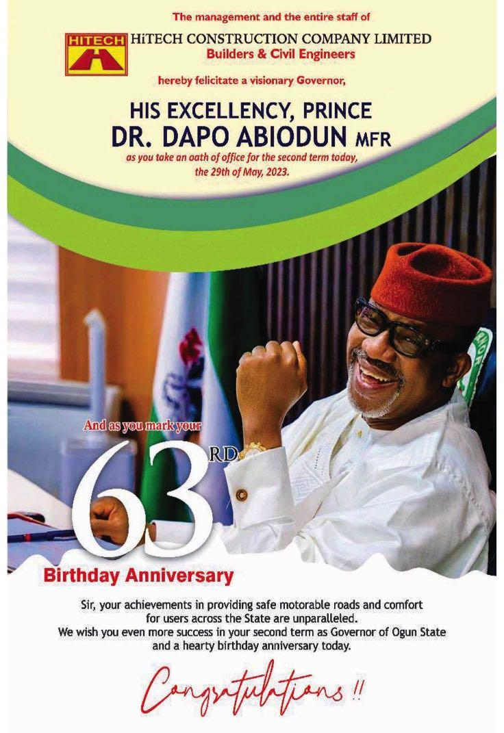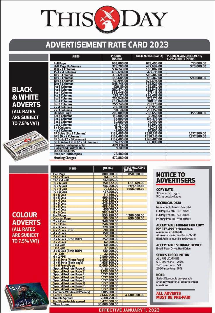 TRUTH & REASON Monday, May 29, 2023Price: N250 Printed and Published in Lagos by THISDAY Newspapers Limited. Lagos: 35 Creek Road, Apapa, Lagos. Abuja: Plot 1, Sector Centre B, Jabi Business District, Solomon Lar Way, Jabi North East, Abuja . All Correspondence to POBox 54749, Ikoyi, Lagos. EMAIL: editor@thisdaylive.com, info@thisdaylive.com. TELEPHONE Lagos: 0802 2924721-2, 08022924485. Abuja: Tel: 08155555292, 08155555929 24/7 ADVERTISING HOT LINES: 0811 181 3085 0811 181 3086, 0811 181 3087, 0811 181 3088, 0811 181 3089, 0811 181 3090. ENQUIRIES & BOOKING: adsbooking@thisdaylive.com