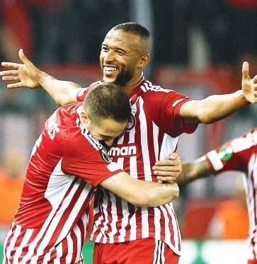 Kaabi (right) scored the winner in added time as Greek side, Olympiakos defeated Fiorentina 1-0 to lift the Europa Conference League trophy...last night