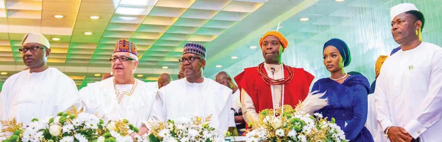 L-R, Executive Chairman, Geregu Power PLC, Mr Femi Otedola; Chairman Chagoury Group, Gilbert Chagoury; Chairman, Dangote Group, Aliko Dangote; His Majesty Olu of Warri Kingdom, Ogiame Atuwatse III; his wife, Olori Atuwatse III with Chairman, Belema Oil, Tein Jack-Rich; during the Presidential Inaugural ball in Aso Villa... on Monday