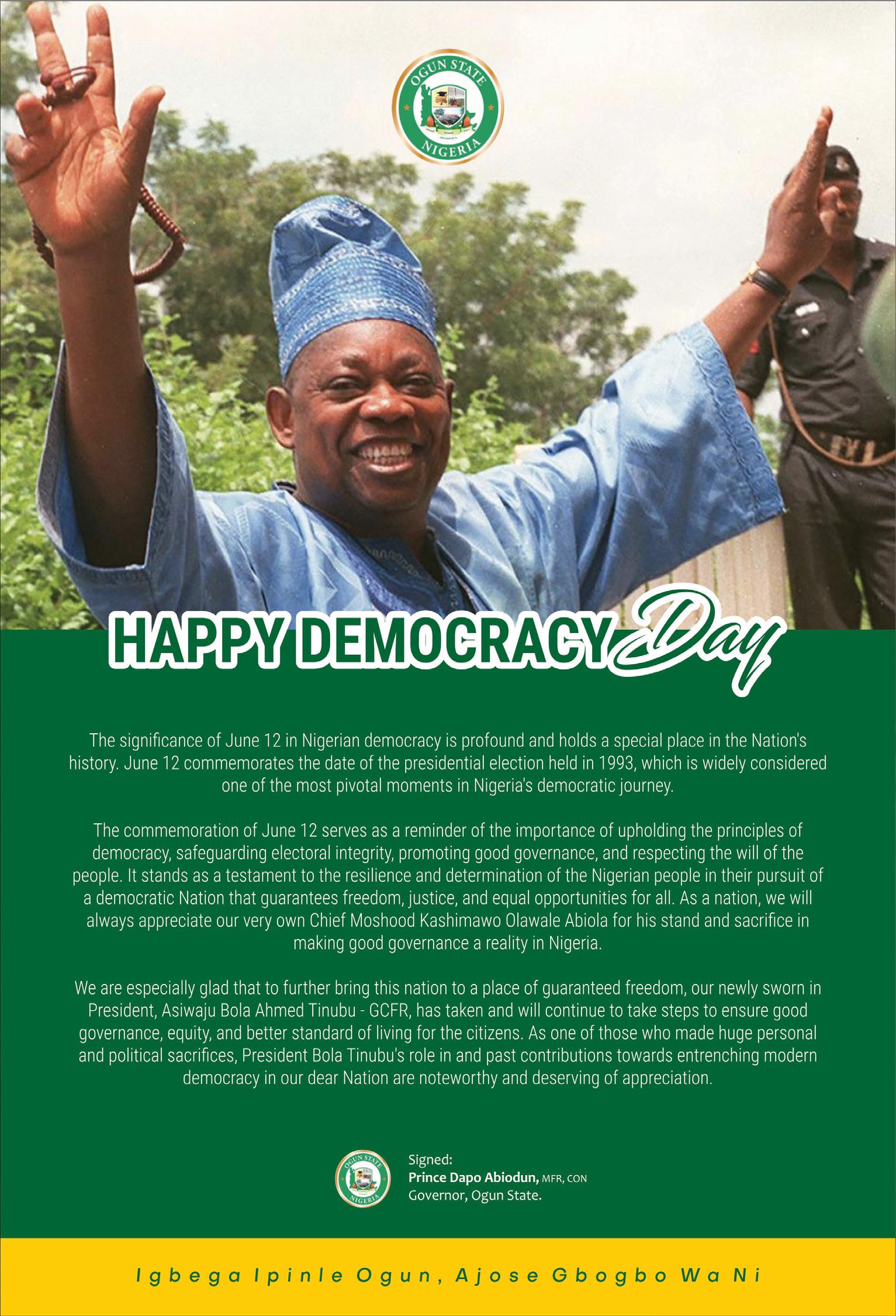 Restoring the spirit of Nigeria's democracy after the June 12 annulment is a long-term endeavour that requires sustained efforts from both the government and the Nigerian people. It demands a commitment to democratic values, active citizen participation and a collective determination to build a more inclusive Nigeria. Now is the time to promote good governance, fight corruption, foster national reconciliation, enhance freedom of speech and conscience, strengthen democratic institutions, encourage citizen participation and engagement as well as ensure further electoral reforms to consolidate on the progress made thus far as we work to deepen our democracy. The signs we see from this new government suggest that we have a government that may push Nigeria forward. The actions of the government in the right direction in the few months to come will surely lay the foundations of a more robust, better democracy. This is wishing our dear country a Happy Democracy Day.