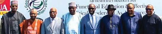 L-R: Nigeria's Minister of Education, Tahir Mamman; Former Vice President, Namadi Sambo; former Vice President of Zambia, Dr. Nevers-Sekwila Mumba; former President of Benin Republic, Boni Yayi; Edo State Governor, Mr. Godwin Obaseki; former Nigeria’s President, Dr. Goodluck Ebele Jonathan; former President of Kenya, Uhuru Kenyatta, and former presidential candidate of the Labour Party, Mr. Peter Obi, during the 2024 Democracy Day Dialogue, organised by the Goodluck Jonathan Foundation, in Benin City... yesterday