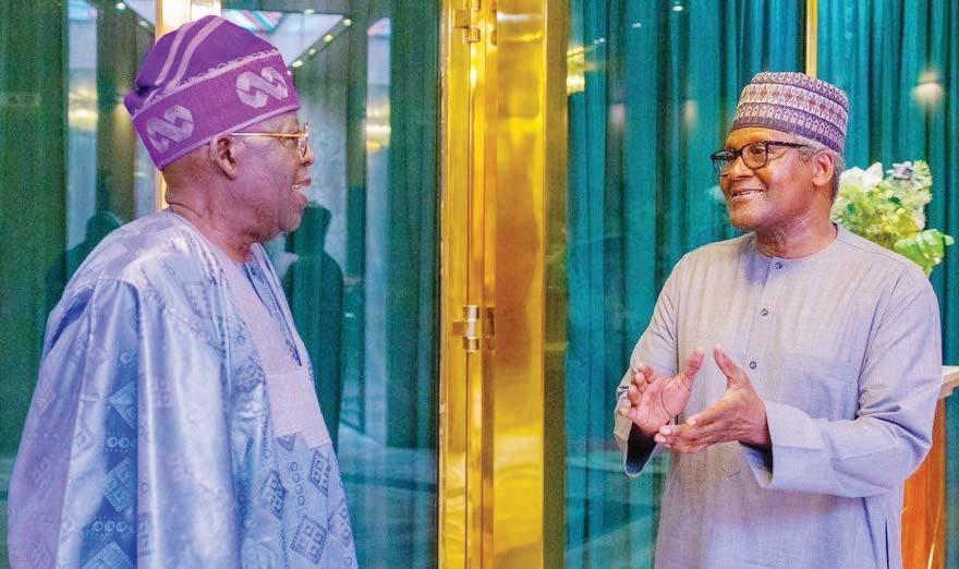 L-R: President Bola Tinubu and President, Dangote Group, Aliko Dangote, during Aliko’s visit to the Presidential Villa, Abuja...yesterday. GODWIN OMOIGUI