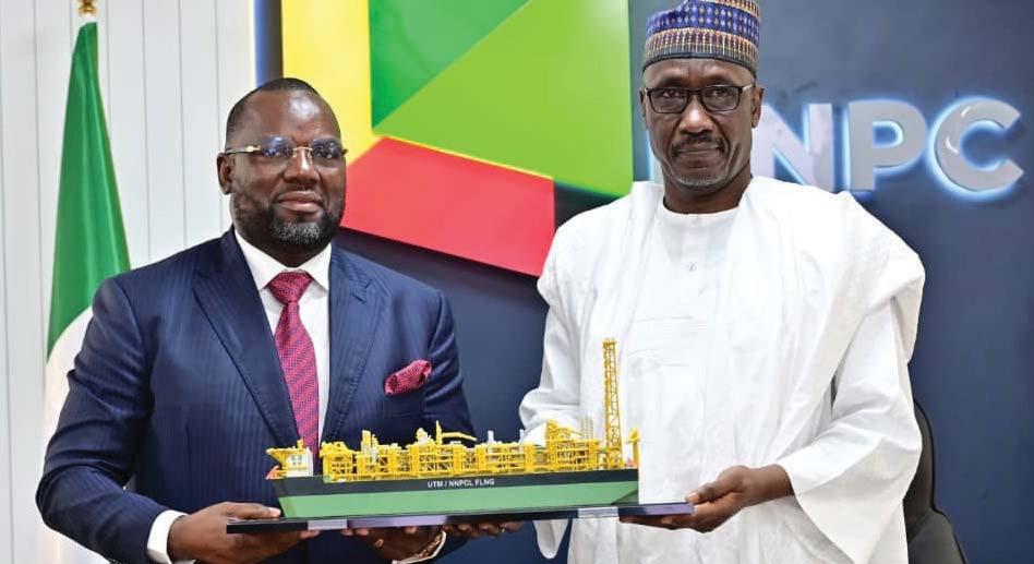 Managing Director of UTM Offshore Limited, Mr. Julius Rone,OFR (left), and Group Chief Executive Officer of Nigeria National Petroleum Company Limited, Mr. Mele Kyari, after the signing of Heads of Terms (HoT) agreement by the two companies for the construction of 1.5 million tonnes per annum (MTPA) FLNG (Floating LNG project) in which NNPC is taking 20% stake in Abuja...yesterday