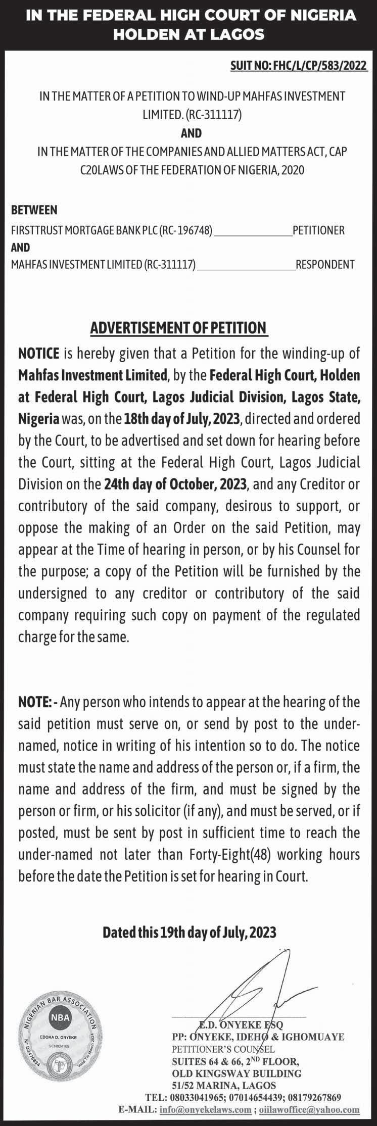 Printed and Published in Lagos by THISDAY Newspapers Limited. Lagos: 35 Creek Road, Apapa, Lagos. Abuja: Plot 1, Sector Centre B, Jabi Business District, Solomon Lar Way, Jabi North East, Abuja . All Correspondence to POBox 54749, Ikoyi, Lagos. EMAIL: editor@thisdaylive.com, info@thisdaylive.com. TELEPHONE Lagos: 0802 2924721-2, 08022924485. Abuja: Tel: 08155555292, 08155555929 24/7 ADVERTISING HOT LINES: 0811 181 3085 0811 181 3086, 0811 181 3087, 0811 181 3088, 0811 181 3089, 0811 181 3090. ENQUIRIES & BOOKING: adsbooking@thisdaylive.com