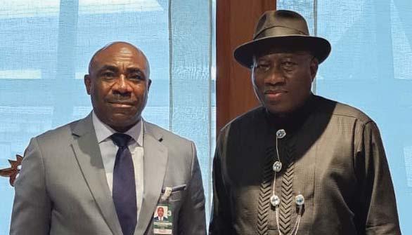 L-R: Nigeria's Ambassador to Thailand, Amb Oma Djebah and former President Goodluck Jonathan at the Executive VIP Lounge of the Suvarnabhumi International Airport, Bangkok as the former President transits to Cambodia as Head of the election Observation Mission to Cambodia...yesterday