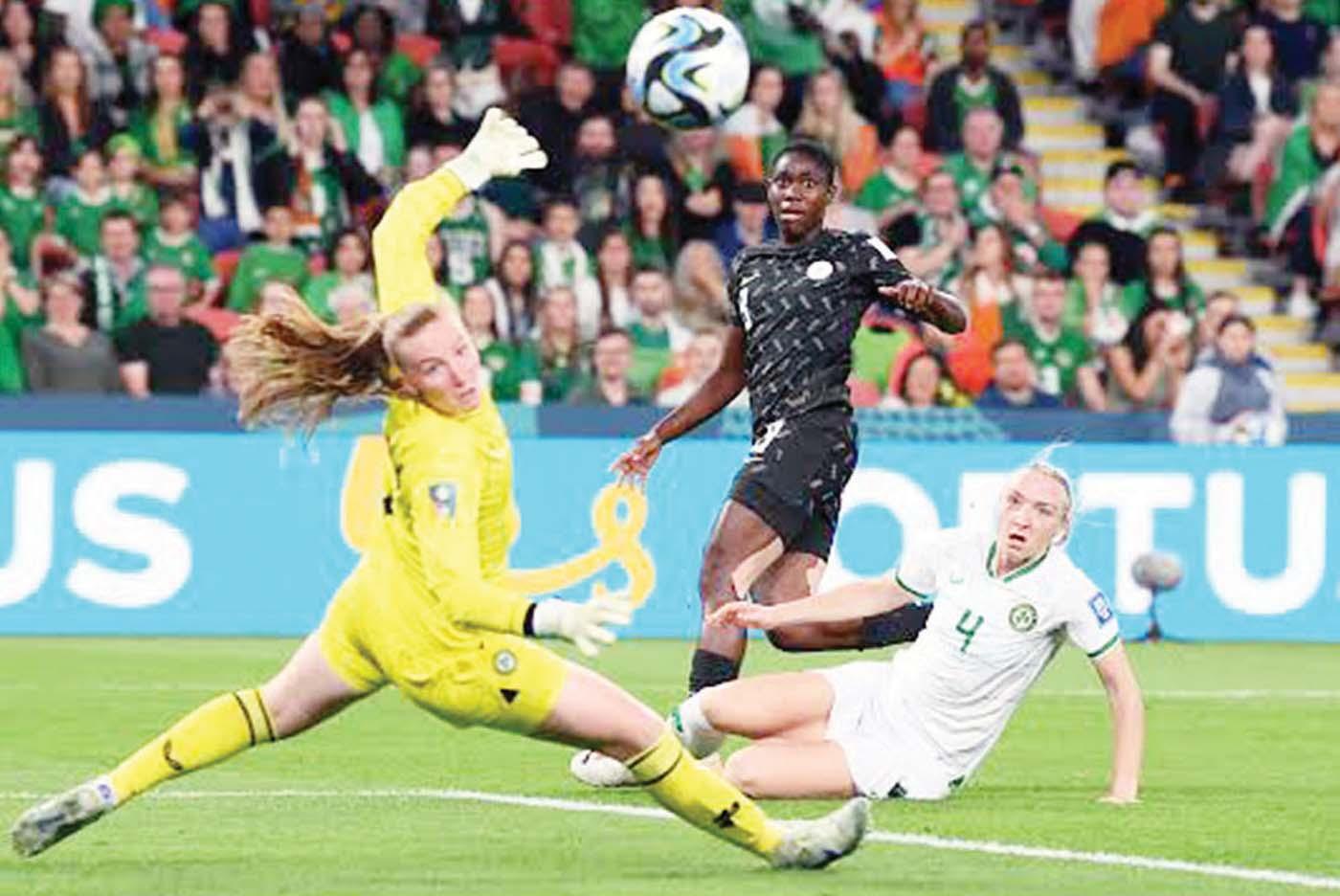 Asisat Oshoala (centre) missed an opportunity against Republic Ireland goalkeeper, Courtney Brosnan , yesterday in Brisbane, Australia. The match ended goalless, allowing Nigeria to join Australia from Group B into the Last 16