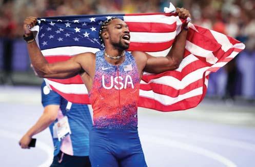 Noah Lyles celebrating winning Paris 2024 Olympic Games 100m gold inside Stade de France on Sunday night