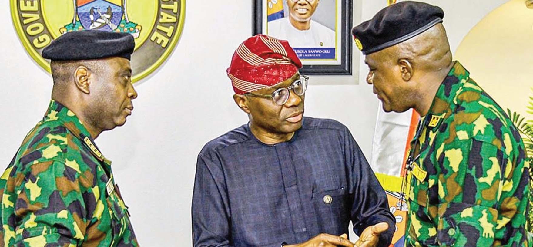 L-R: Chief of Naval Staff, Vice Admiral Emmanuel Ogalla; Lagos State Governor, Mr. Babajide Sanwo-Olu, and Commander NNS BEECROFT, Commodore Kolawole Oguntoga, during a courtesy visit to the Governor by the Chief of Naval Staff, at the Government House, Marina... yesterday