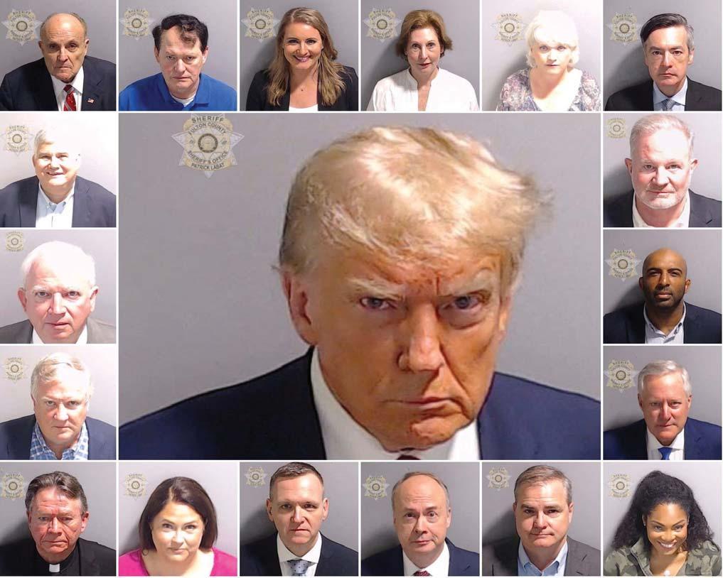 (middle) and the 18 people indicted along with him in Georgia on charges that they participated in a wide-ranging illegal scheme to overturn the results of the 2020 election after turning themselves in to a jail in Atlanta before the deadline at noon… yesterday.