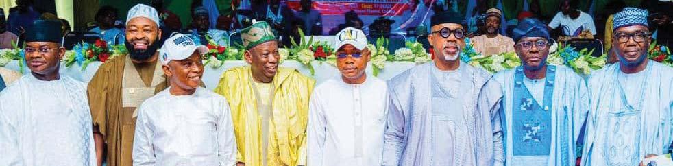 L-R: Kogi State Governor, Yahaya Bello; his Niger State counterpart, Mohammed Bago; Kogi State APC Deputy Governorship Candidate, Joel Salifu Oyibo; APC National Chairman, Abdullahi Ganduje; Kogi State APC Governorship Candidate, Usman Ododo; Ogun State Governor and Chairman, National Campaign Council for Kogi State Gubernatorial Election, Prince Dapo Abiodun; Lagos State Governor, Babajide Sanwo-Olu and his Kwara State counterpart, AbdulRahman AbdulRazaq, at the inauguration of the Kogi State National Gubernatorial Campaign Council, in Lokoja, on Saturday.