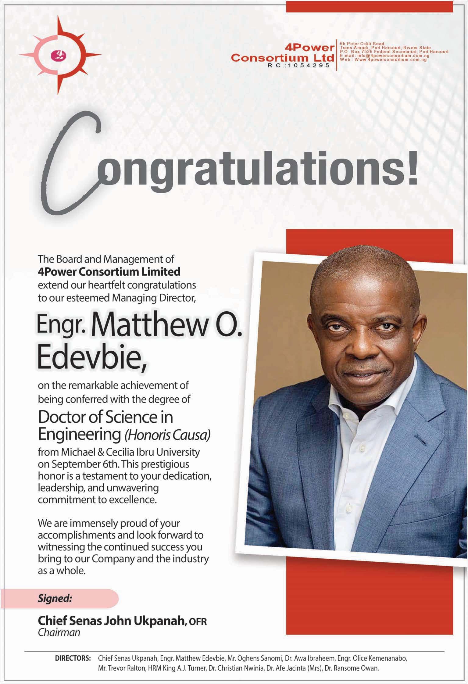 The president approved the appointment of board and management of the Niger Delta Development Commission (NDDC). He named Chiedu Ebie from Delta State as Chairman, while Samuel Ogbuku from Bayelsa State was appointed Managing Director/CEO.