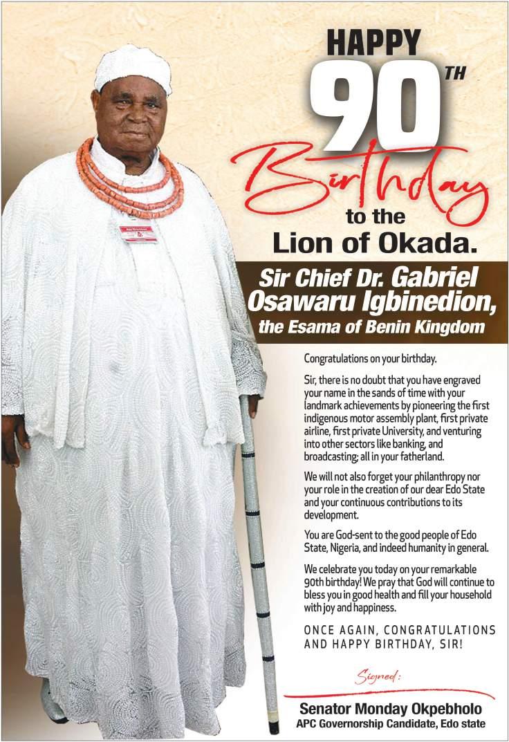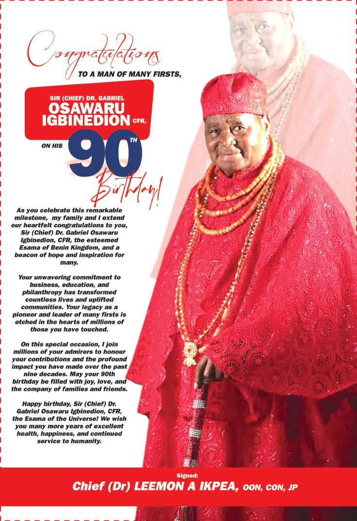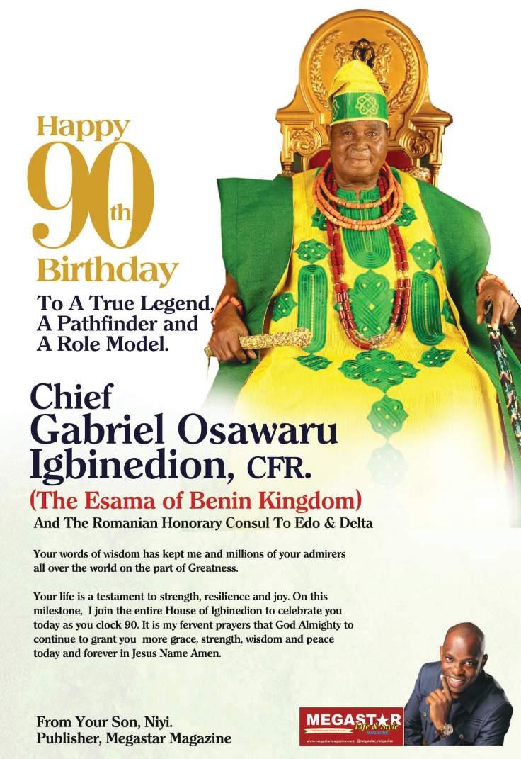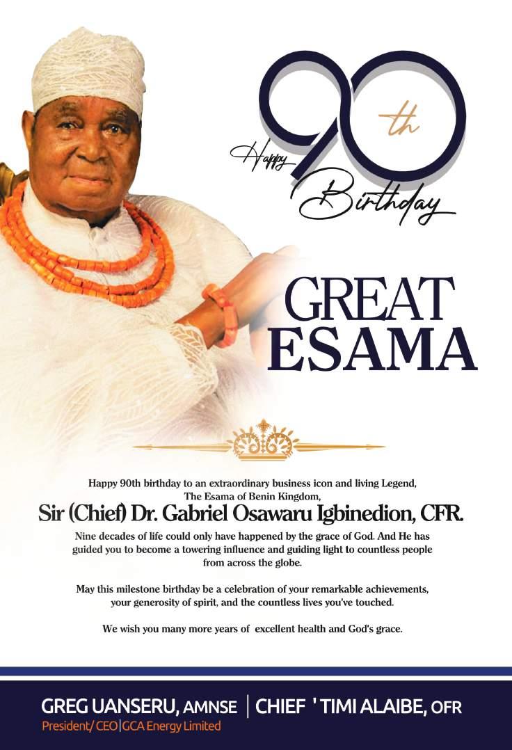 President Bola Tinubu has congratulated the Esama of Benin, Chief Gabriel Igbinedion for attaining milestone age of 90 on Wednesday, September 11, 2024. The President, in a statement issued by his Special Adviser on Information and Strategy, Bayo Onanuga, praised the Esama for his lifetime achievements and trail-blazing as a businessman, philanthropist, and advocate for education and community development.