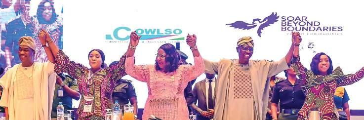 R-L: Chairman, Committee of Wives of Lagos State Officials, COWLSO/First Lady of Lagos State, Dr. (Mrs) Ibijoke Sanwo-Olu; Governor Babajide Sanwo-Olu; Deputy Governor of Akwa Ibom State, Senator Akon Eyakenyi; COWLSO Vice Chairman/wife of the Lagos State Deputy Governor, Mrs. Oluremi Hamzat and Dr. Obafemi Hamzat (right) during the opening ceremony of the 24th National Women Conference themed: “Soar Beyond Boundaries …Enrich Communities” organised by COWLSO, at the Eko Hotels & Suites, Victoria Island, Lagos... yesterday
