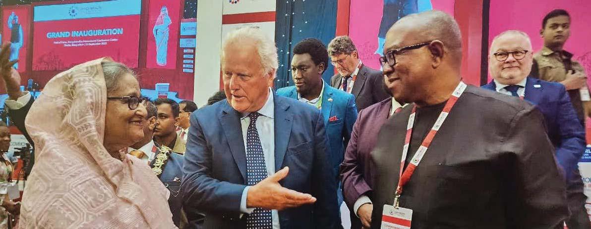 L-R: Prime Minister of Bangladesh, H. E. Sheikh Hasina; Chairman, Commonwealth Enterprise and Investment Council, Lord Marland of Odstock, and presidential candidate of Labour Party in the 2023 election, Mr. Peter Obi, during an interaction at the Commonwealth Trade and Investment Forum, in Dhaka, Bangladesh…recently