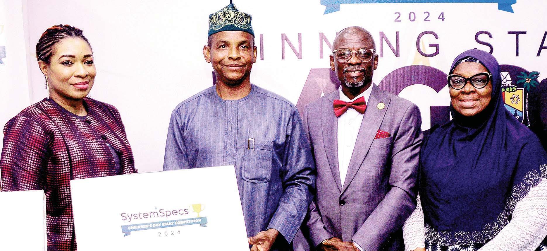 Managing Director of 1XBET, Dr. Femi Babalola (left) being assisted by Super Eagles Interim Coach, Augustine Eguavoen, NFF Board Member, Aisha Falode and other unnamed officials to present the 2024 1XBET Cup winner's trophy to the captain of FC Bethel at the Mobolaji Johnson Arena on Lagos Island... yesterday evening