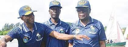 Navy Sailing Club, Chief Jasper Ogbuagu; Commander, Navy Ship Way/Chief Host, Commander Mohammed Dahiru, and Commanding Officer, Nigeria Navy Ship NNS Quorra, Commodore Adamu Yahaya, during the club’s boat race to commemorate Nigeria’s 63rd Independence Anniversary in Lagos... yesterday daN uKaNa