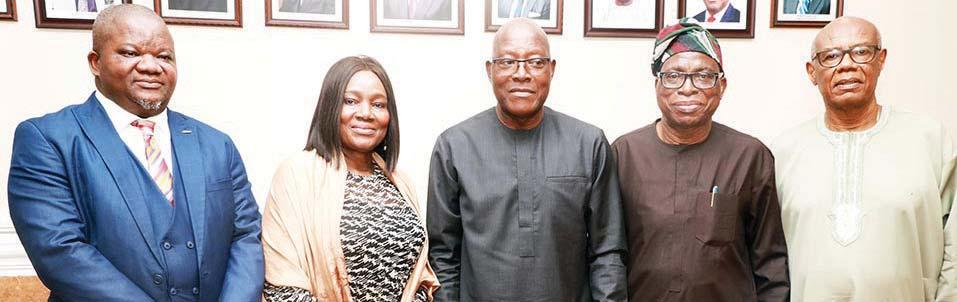 L-R: Head, Press and Public Relations Unit, Federal Ministry of Environment, Ibrahim Haruna; Director-General/Chief Executive Officer, National Oil Spill Detection and Response Agency (NOSDRA), Engr. Chukwuemeka Woke; Executive Vice President, Oando Clean Energy Limited (OCEL), Ademola Ogunbanjo; Minister of state for Environment, Honourable Minister Iziaq Adekunle Salako; Managing Director, Oando Energy Resources Nigeria Limited, (OERNL), Dr. Ainojie ‘Alex’ Irune; Director of Pollution Control and Environmental Health, Federal Ministry of Environment, Engr. Bahijjahtu Abubakar; and Vice President, Opportunity Maturation and New Ventures OCEL, Hadiza Adukonu, during a courtesy visit to the Federal Ministry of Environment in Abuja...on Wednesday