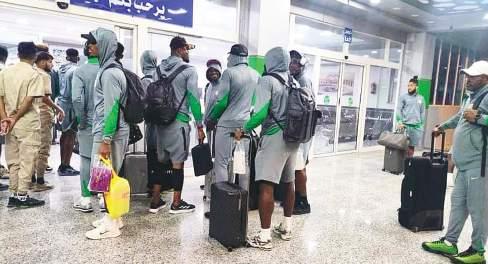 Super Eagles players and officials going through immigration formalities with Libyan aviation officials