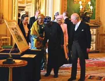 President Tinubu and First Lady being shown a display of objects from The Royal Collection Trust in the Green Drawing Room at Windsor Castle