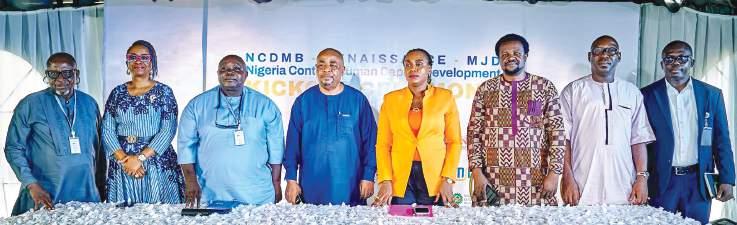 L-R: Project Manager (Pigging), MJD Oilfield Services Ltd, Chief Austin Ugboaja; Managing Director(MD), Language and Skills Development Consulting, Ms. Stella Nnodi; MD, MJD Oilfield Services Ltd, Olayemi Familusi; MD, Doret Technologies Ltd, Dr Daniel Thomas; Manager, Human Capital Development, Nigerian Content Development and Monitoring Board (NCDMB), Mrs Tarilate Bribena-Teide; Head, Pipelines RoW, Encroachment Management & Emergency Repairs, Renaissance Africa Energy Company, Gbenga Alabuja; Funsho Alabi of Renaissance Africa Energy Company, and Supervisor, Human Capital Development, NCDMB, Ayimovie Ikiogha, at the kickoff of the MJD/Renaissance/NCDMB-sponsored Nigerian Content Human Capital Development (NC-HCD) training programme in Port Harcourt, Rivers State… recently