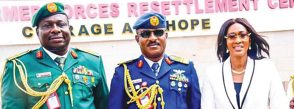 L-R: Major General AO Oyelade; Commandant of the Nigerian Armed Forces Resettlement Centre (NAFRC), Oshodi, Lagos, Air Vice Marshal Nnaemeka Ignatius Ilo; and Country Representative of EMPRETEC Nigeria Foundation, Dr. Onari Duke, at the graduation of participants of the Middle and Senior Level Officers Entrepreneurship and Management Course 17/2026 from NAFRC, yesterday