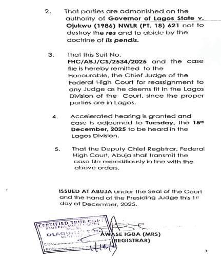 The citation highlights his notable roles as a former Lagos State Commissioner, former Secretary to the State Government, and current Chief Executive Officer and Executive Vice Chairman of the Federal Competition and Consumer Protection Commission (FCCPC).