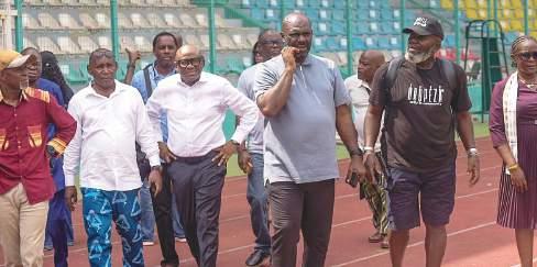 R-L: Niger Delta Games officials, Edi Lawani and Sir Itiako Ikpokpo and Edo Sports Commission Chairman, Desmond Amadin Enabulele with NDG official, Fred Edoreh during the facility tour of the Samuel Ogbemudia Stadium in Benin City...yesterday