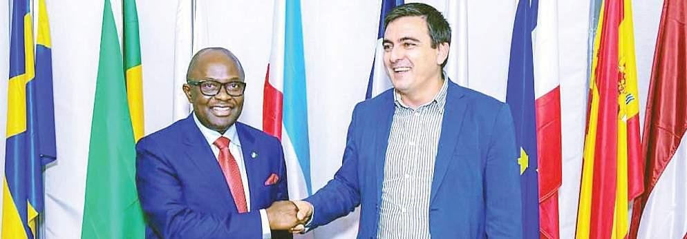 The Director-General/CEO, National Oil Spill Detection and Response Agency (NOSDRA), Engr. Chukwuemeka Woke (left), and the acting Head, European Union Delegation to Nigeria and ECOWAS, Mr. Ruben Alba (right), in warm handshakes during a strategic meeting at EU’s mission office in Abuja
