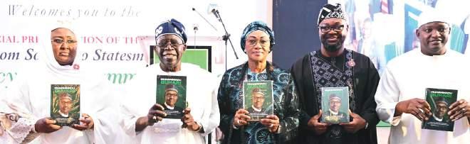 L- R: Wife of late former President, Aisha Buhari; President Bola Ahmed Tinubu; Wife of the President, Oluremi Tinubu; Author of the Book, Dr. Charles Omole and Gambia President, Adama Barrow, during the official presentation of the book from Soldier to Statesman “ The Legacy of Muhammadu Buhari” at the presidential Villa Abuja ...yesterday
