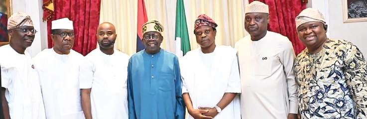 L-R: Lagos State Governor, Mr. Babajide Sanwo-Olu; Leader of the Senate, Senator Opeyemi Bamidele; Executive Chairman, Nigeria Revenue Service, Dr. Zacch Adedeji; President Bola Ahmed Tinubu; Chairman, House of Representatives Committee on FERMA, Hon. Aderemi Oseni; Ekiti State Governor, Mr. Biodun Oyebanji and Chairman, Senate Committee on Appropriations, Senator Solomon Adeola after a consultative meeting to the president at the Dodan Barracks, Lagos …