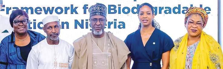 L-R: Director II, Pollution Control and Environmental Health, Omotunde Adeola; Representative of the Hon. Commissioner of Environment and Climate Change, Kano State, Dr. Umar Saleh Anka; Hon. Minister of Environment, Mallam Balarabe Abbas Lawal; Vice President, Business and Opportunity Maturation, Oando Clean Energy Limited, Hadiza Adukonu; and Director, Pollution Control and Environmental Health, Engr. Bahijjahtu H. Abubakar, FNSE, at the Oando Clean Energy Agenda One Day Workshop on Biodegradable Technology in Single Use Plastics, held at the Federal Ministry of Environment, Maitama, Abuja …recently