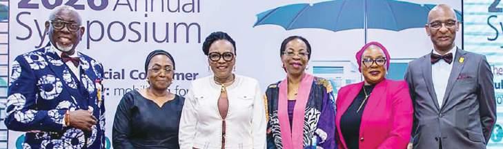 L-R Chairman, Creazioni Nigeria Limited, Otunba Ayodeji Osibogun; member, Churchfield Solicitors, Oluwatoyin Bashorun (SAN); President, Consumer Awareness and Financial Enlightenment Initiative, Lady Debola Osibogun; Founder, Consumer Advocacy Foundation of Nigeria, Sola Salako-Ajulo; Director, Consumer Protection and Financial Inclusion, Central Bank of Nigeria, Aisha IsaOlatinwo; and Chairman, Proshare Limited, Olufemi Awoyemi, during the 2026 CAFEi Symposium on Financial Consumer Vulnerability, held at the Bankers House in Lagos…recently