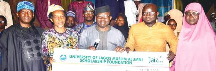 L-R: National President, University of Lagos Muslim Alumni Association (UMA), Dr. Mumini Alao; Chairman of the Scholarship Committee, Prof. Luqman Adams; Board of Trustees Member, Dr. Muiz Banire (SAN); and representatives of UMA’s 2025/2026 academic session’s 23 scholarship beneficiaries, Ibrahim Amoo Bashir and Marufah Baruwa-Yakubu, during the presentation of a dummy cheque for N14,250,000 to the beneficiaries at the association’s 36th AGM held at the UNILAG Mosque Islamic Centre… recently