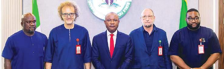 L-R: Member representing Etinan/Nsit Ibom/Nsit Ubium Federal Constituency in House of Representatives, Hon Paul Ekpo; Senator representing the Plateau Central Senatorial District, Diket Plang; Chairman Senate Committee on South East Development Commission, (SEDC), Orji Kalu; President of the Senate, Godswill Akpabio; Chairman, Senate Committee on North West Development Commission, (NWDC), Babangida Hussaini and Chief of Staff to the Senate President, Chinedu Akabueze, welcoming Akpabio to Plenary .....yesterday