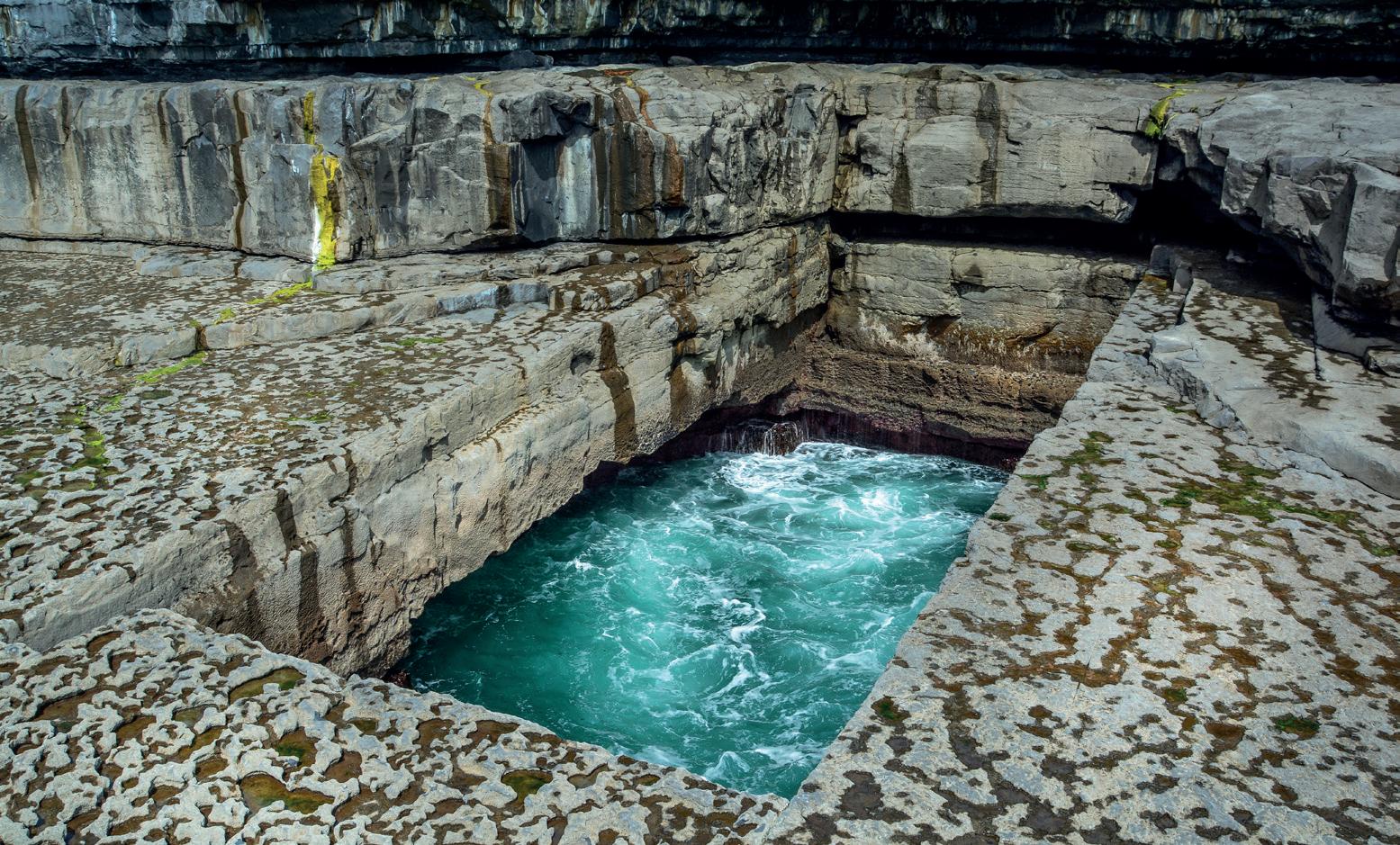 About 1.6km south of Dún Aonghasa, you’ll come across another spectacular attraction. Inis Mór’s Wormhole is a naturally formed rectangular limestone pool into which the sea splashes, creating quite the scene. We recommend waiting to see the waves crash directly into the Wormhole so that you can watch the mesmerising tiny waterfalls effect it creates.