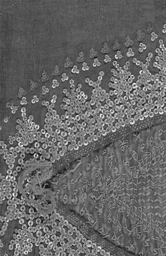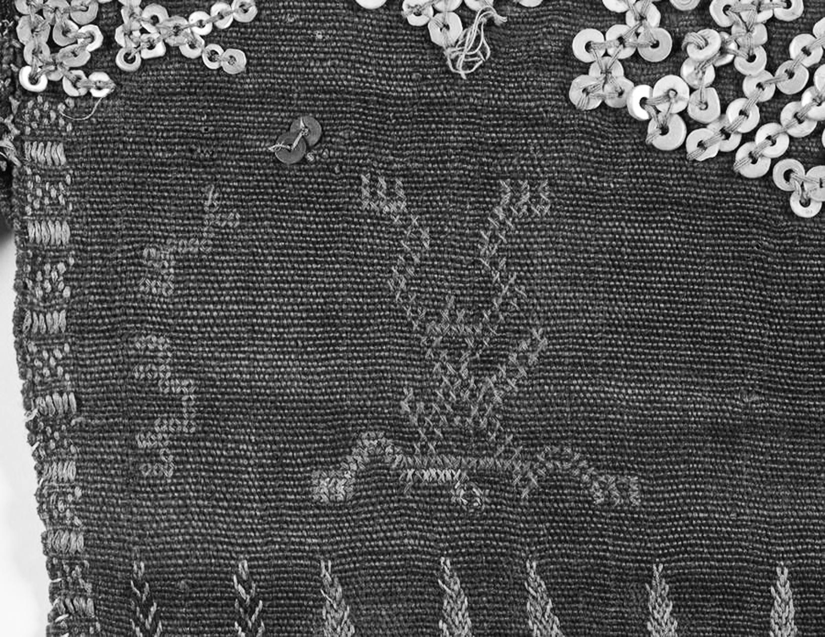 Abaca fiber, bast fiber, mother-of-pearl disks, metal sequins; plain weave with embroidery and applique