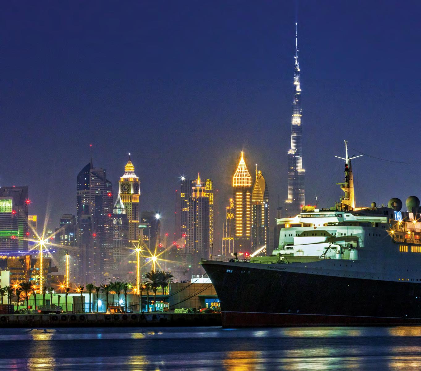 As the sun rises over Dubai, The Queen Elizabeth 2’s sleek lines and magnificent profile are on full display. Now permanently moored off the coast of Dubai, the QE2 stands tall as a symbol of a bygone era, a living testament to a time when luxury and sophistication were the hallmarks of oceanic travel. Originally built for the prestigious Cunard Line, this luxury liner was once the pride and joy of the fleet, serving as the flagship for nearly four decades. Now, the UAE is her home.