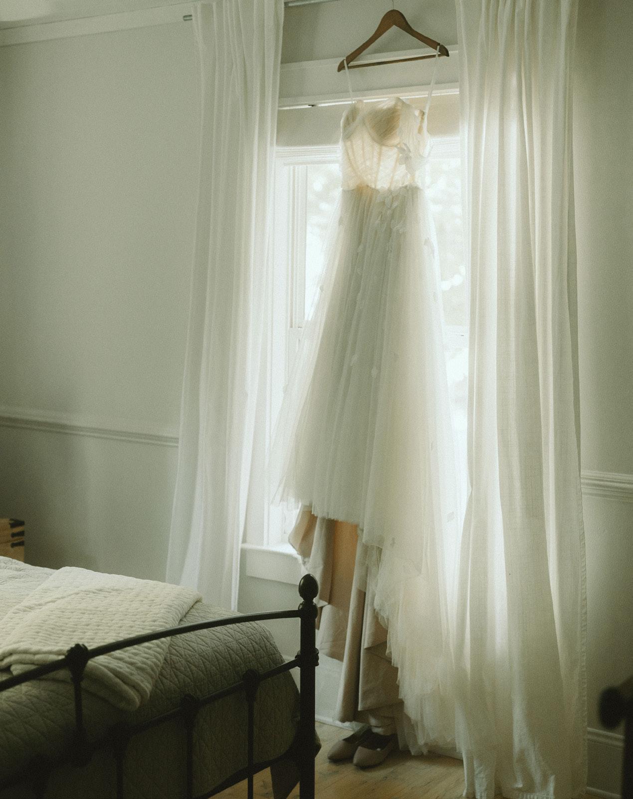 IF you are getting ready in a hotel room, consider getting an extra room OR asking friends if their room can be cleaned and used as a clutter-free zone — aka: people’s belongings are not allowed to be there! Are you getting ready at your venue? Perhaps there is a whole separate room where the dress can be photographed free of clutter. In both of these options, light is something to take note of as well. I typically like to be able to shoot in a room with all of the lights off, so this means lots of good natural light. Mixed light of any kind (natural light + lamps + overhead lights) tend to lead to odd skin tones.