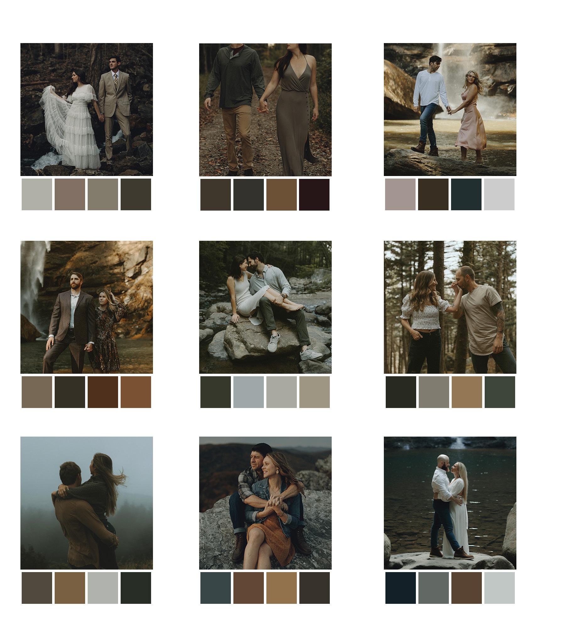 I have found with the best colors are darker, earth-toned colors. This can be burnt oranges, maroons, hunter greens, browns, mustard yellows, + grays. Even denim and white photograph beautifully! The best combos usually have someone wearing a lighter color and the other is in darker clothing. BUT that is not a rule. I am the furthest thing from a fashion expert!