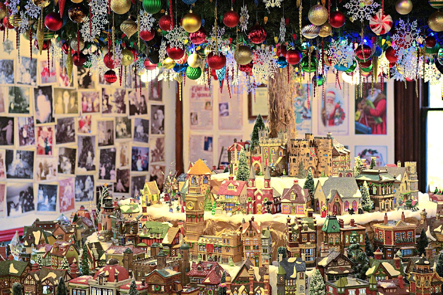 Village beneath the bough of a giant Christmas tree, along with trains, old family photos, stockings hung on the mantle and favorite moments from ‘A Christmas Carol.’ The exhibit is free and open daily.